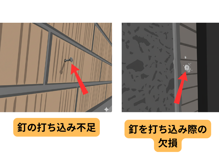 この工法は釘の力で耐震性を確保しているため雨漏りなどで釘が錆びると耐震性が低下します。